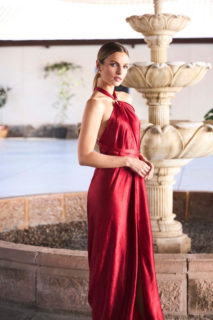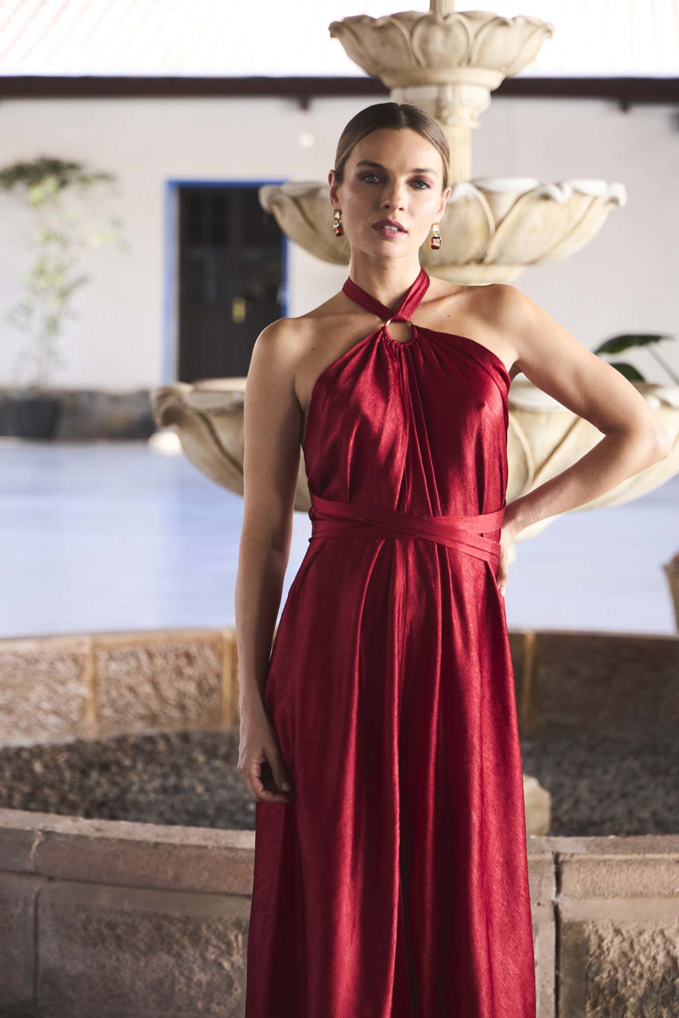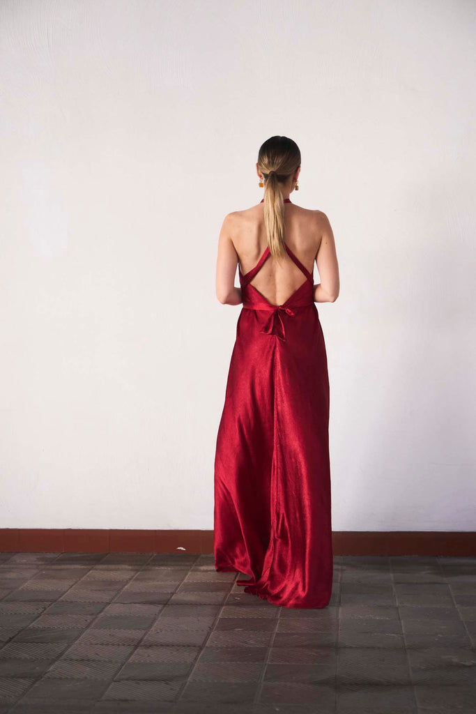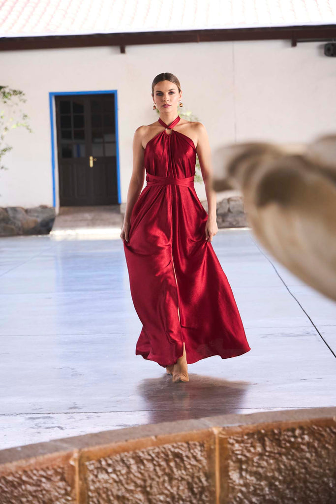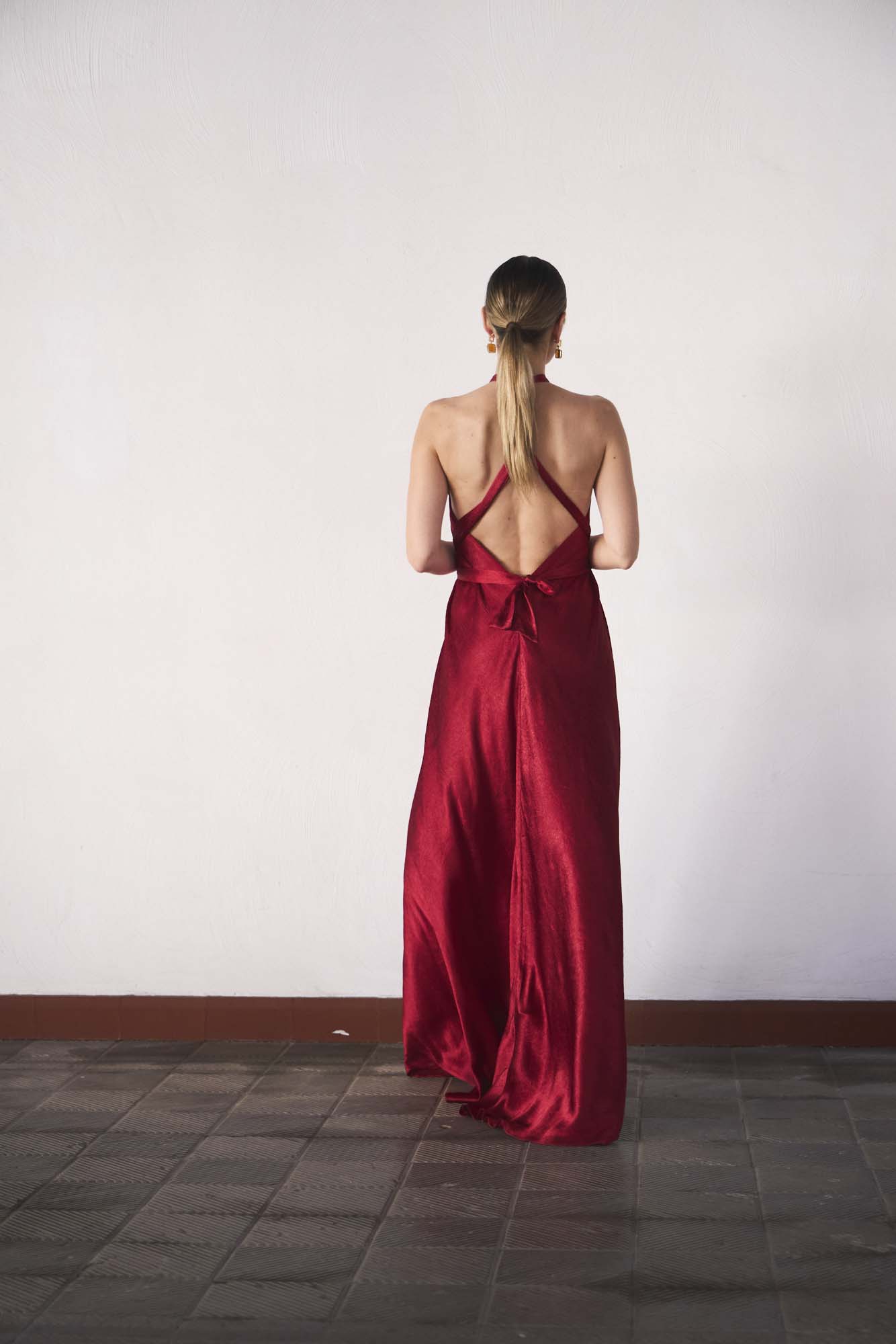 • Vestido de cuello halter con argolla y espalda descubierta.