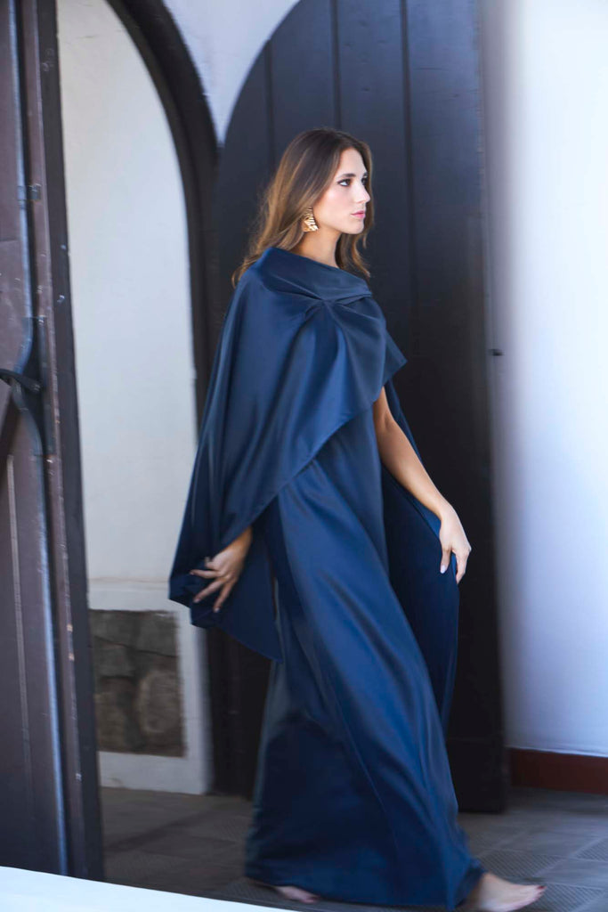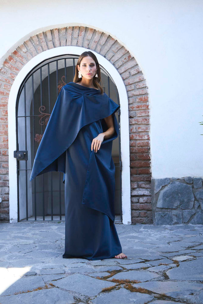 • Vestido largo cuello en V. Sobre el vestido se amarra una capa.