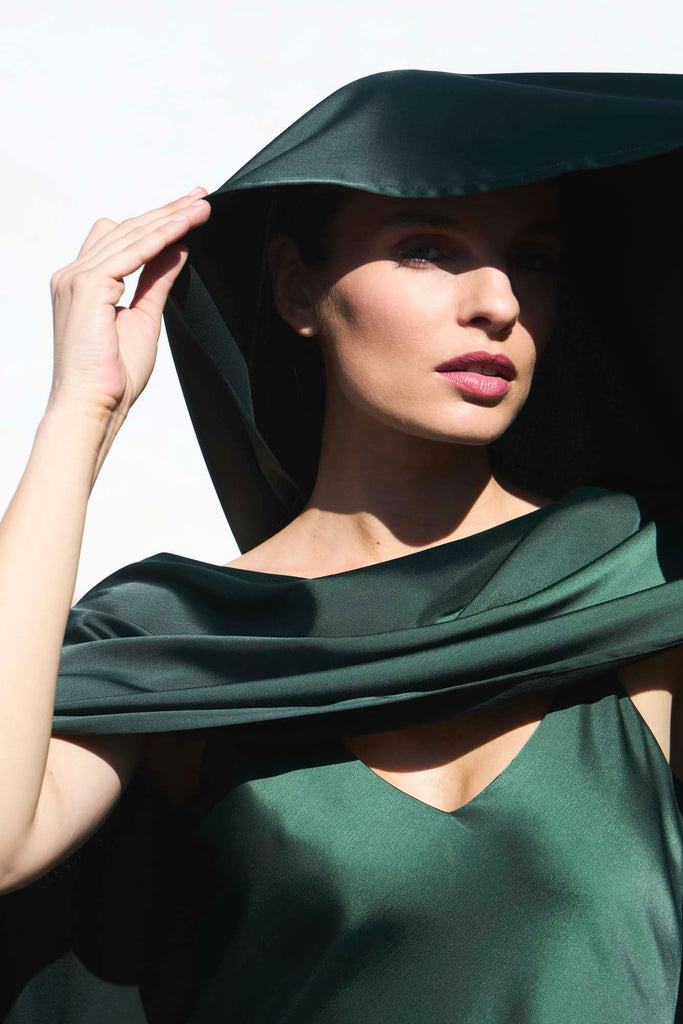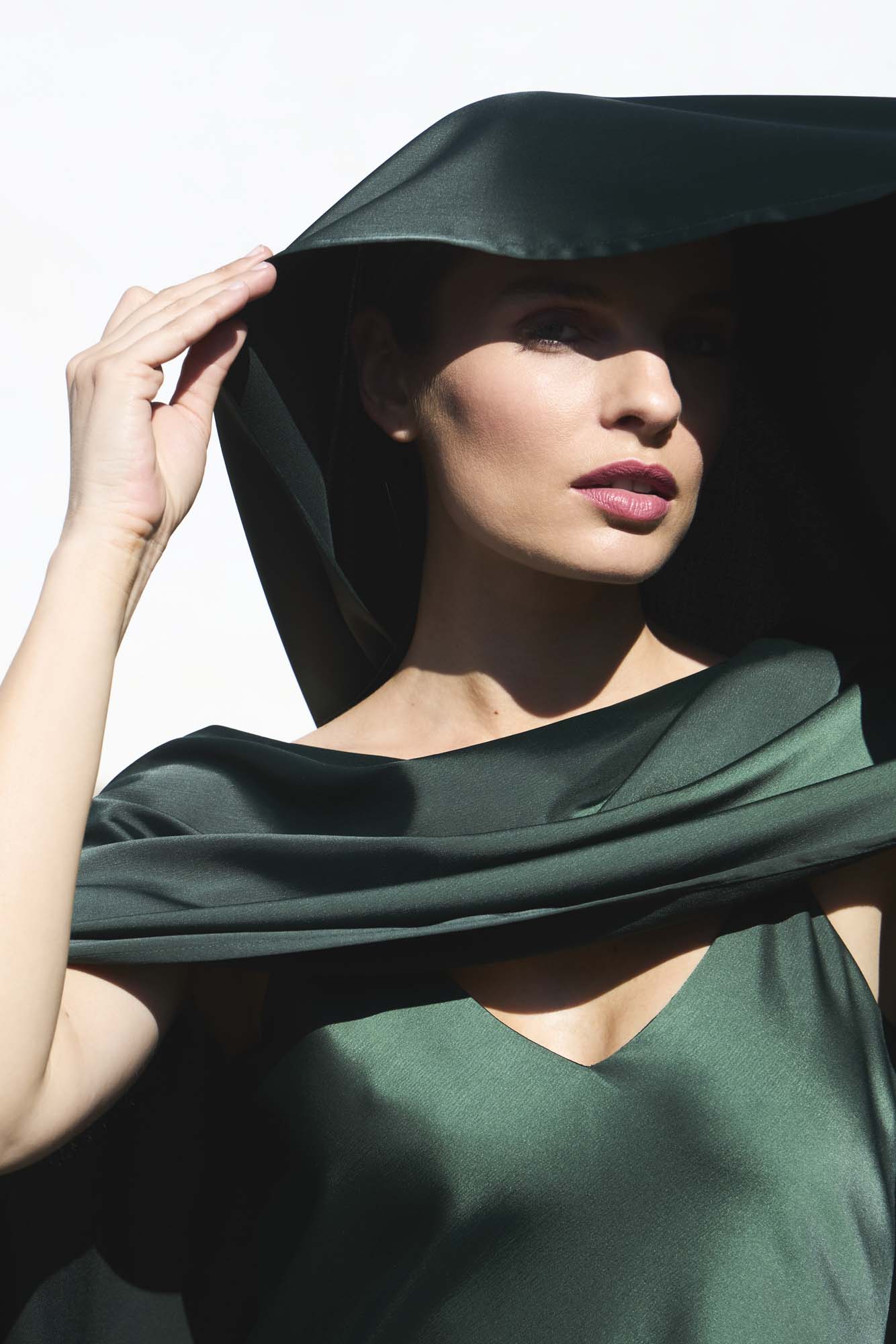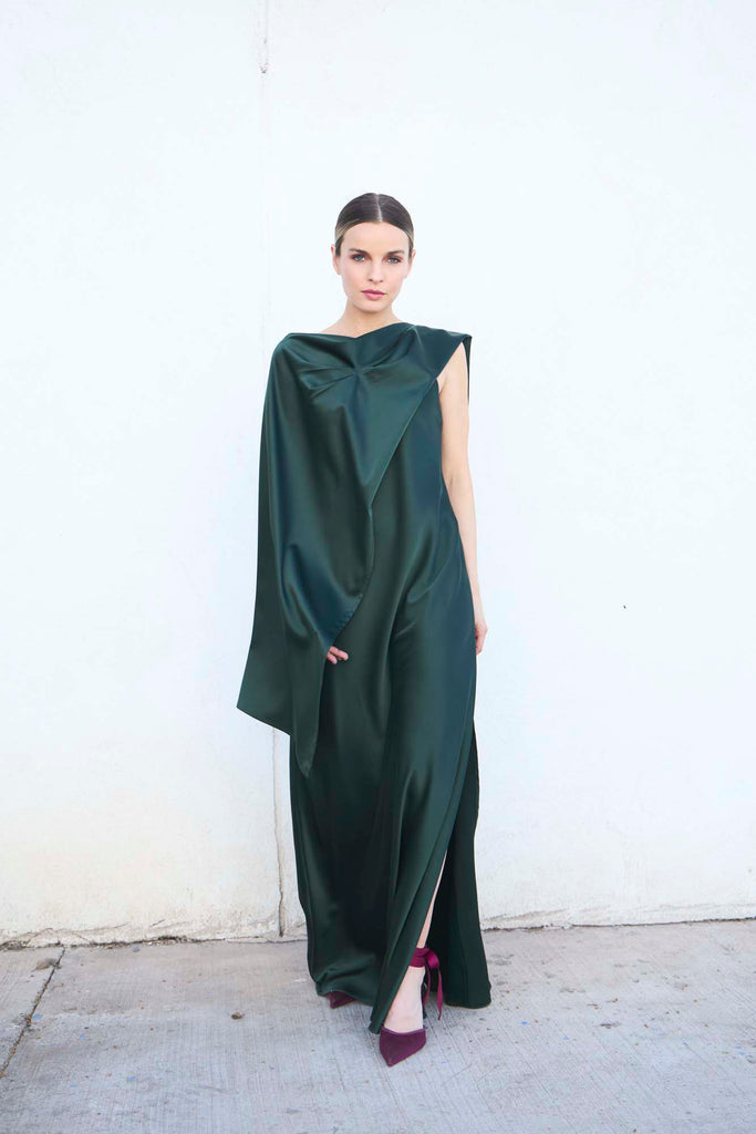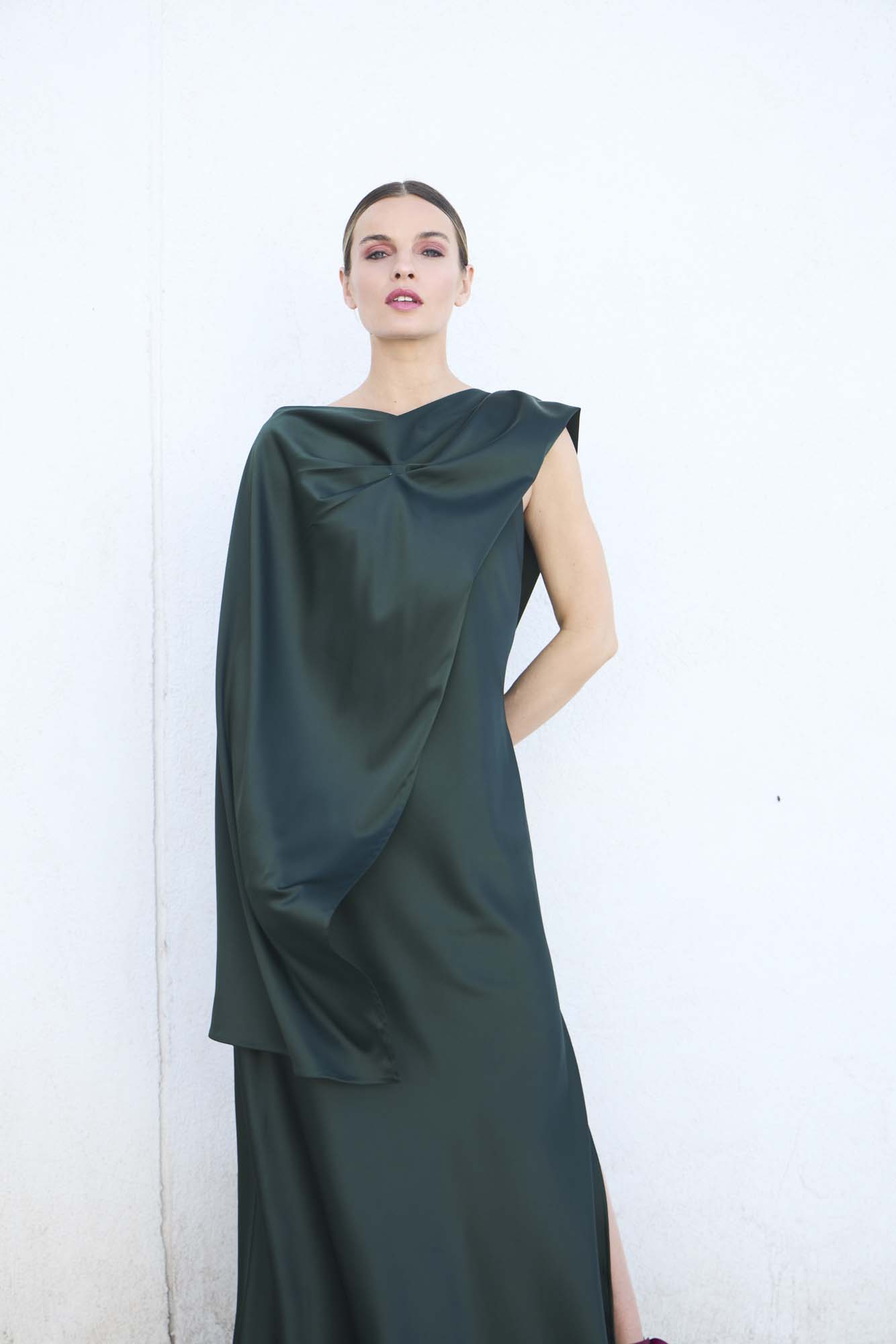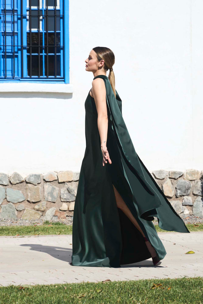 - Vestido largo cuello en V. Sobre el vestido se amarra una capa.
