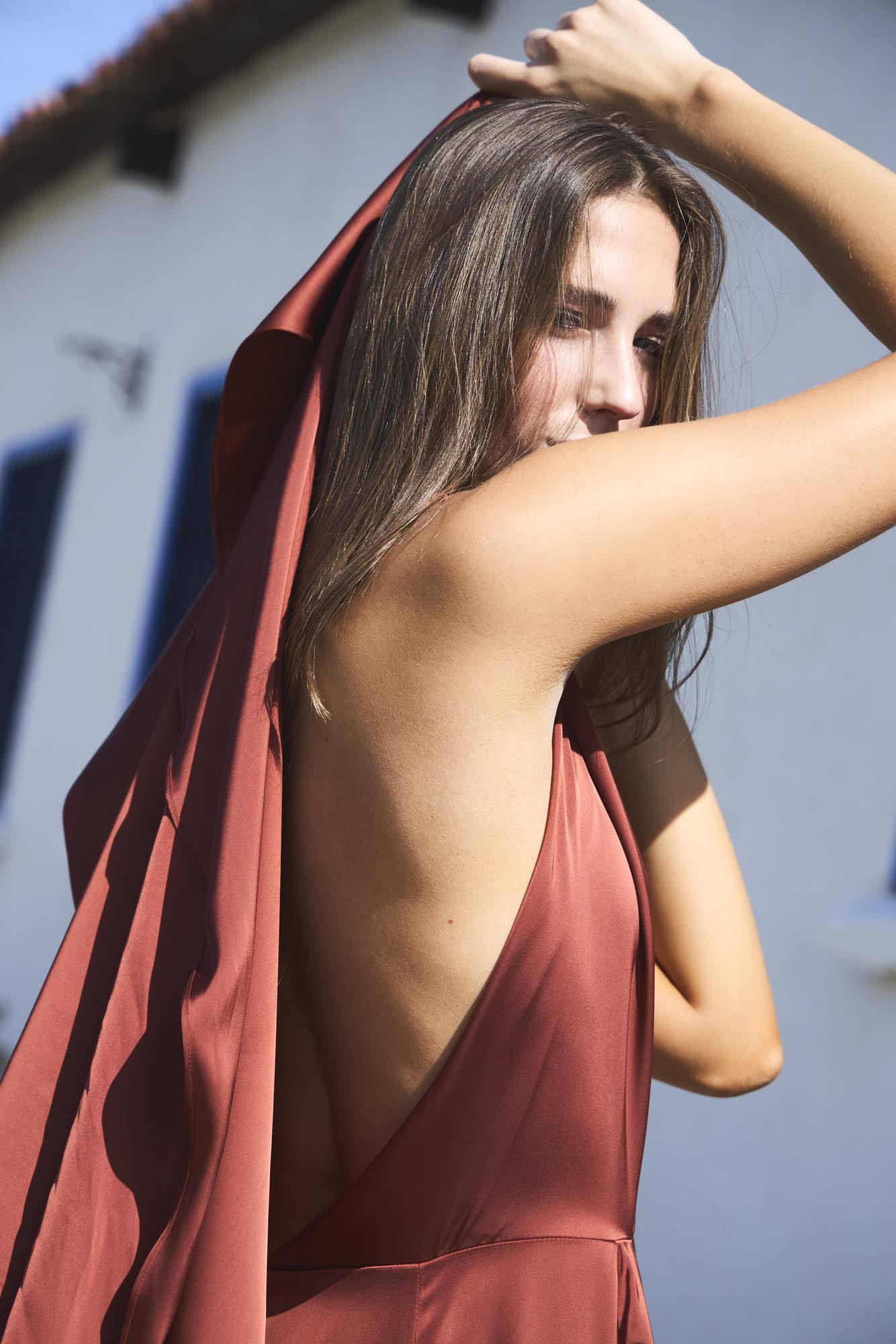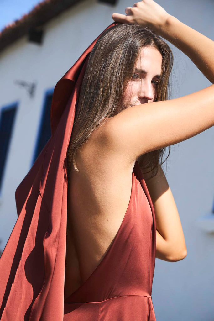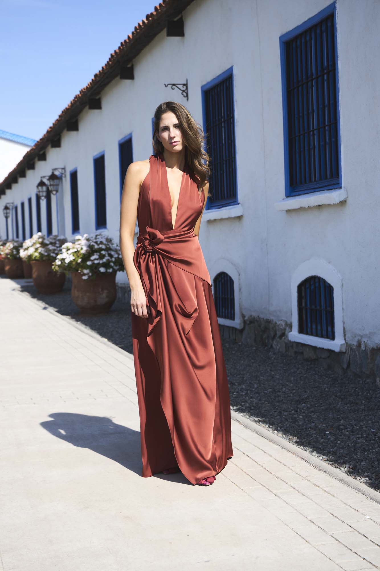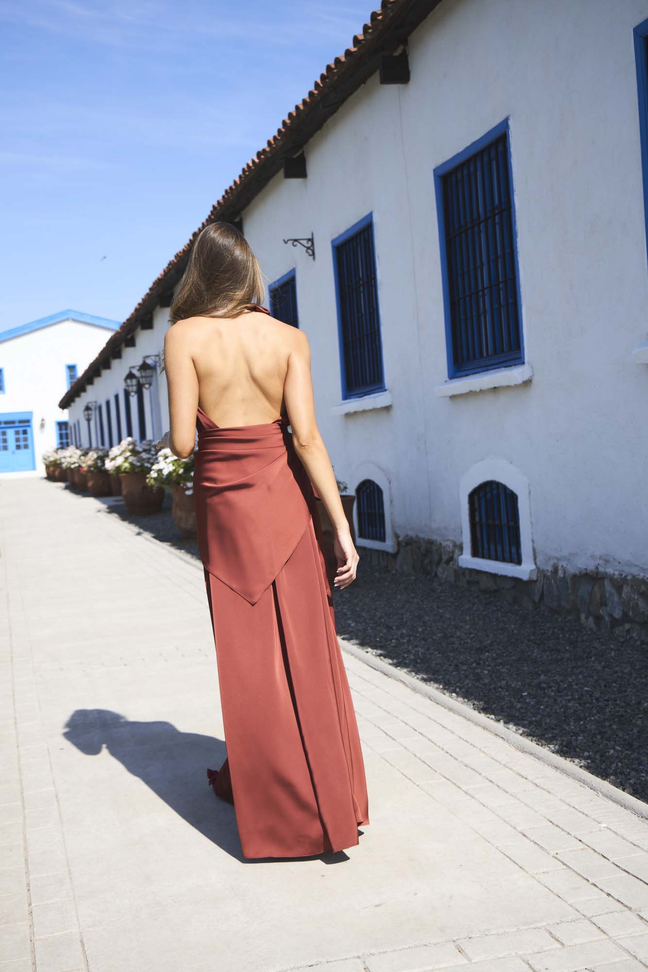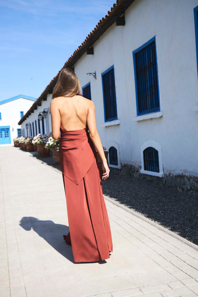 • Vestido largo amarrado al cuello. Descubierto en la espalda hasta la altura de la cintura.